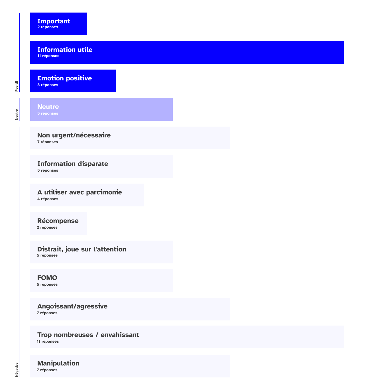 Les notifications sont principalement perçues comme négatives, avec une large majorité des mots-clés de cette catégorie. Cependant l’aspect positif reste présent avec, par exemple, l’aspect d’informations utiles.