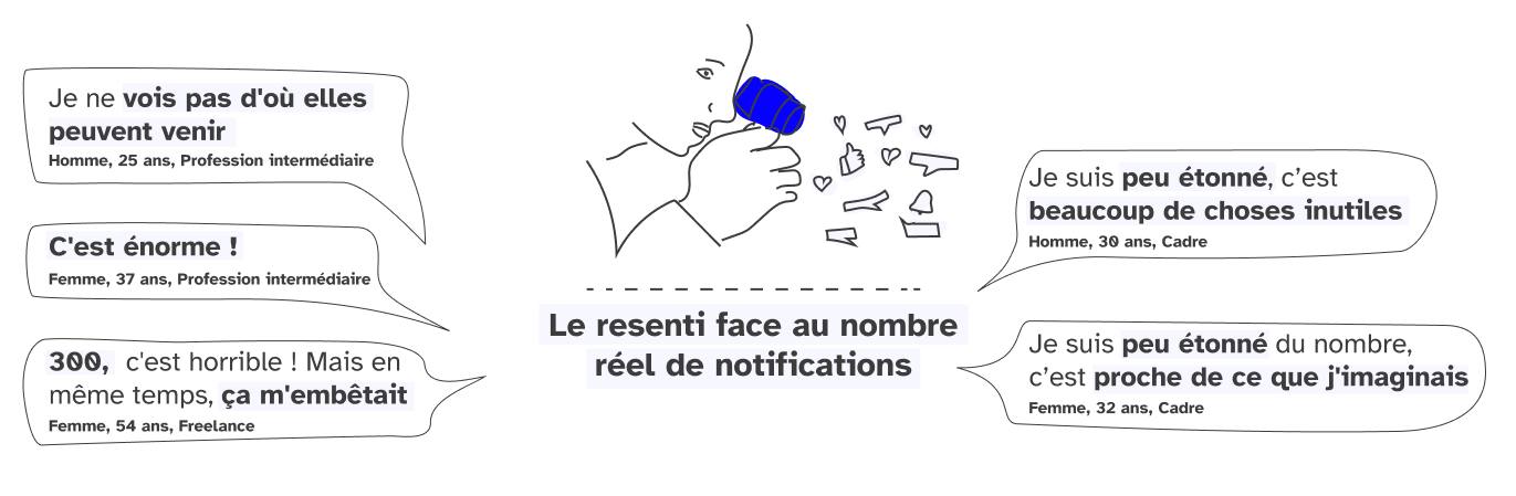 Nous voulions en savoir plus sur les notifications reçues en 24h (nombre type, ressenti). Nous avons interrogé les interviewés sur le nombre de notifications qu’ils imaginaient recevoir en 24h,