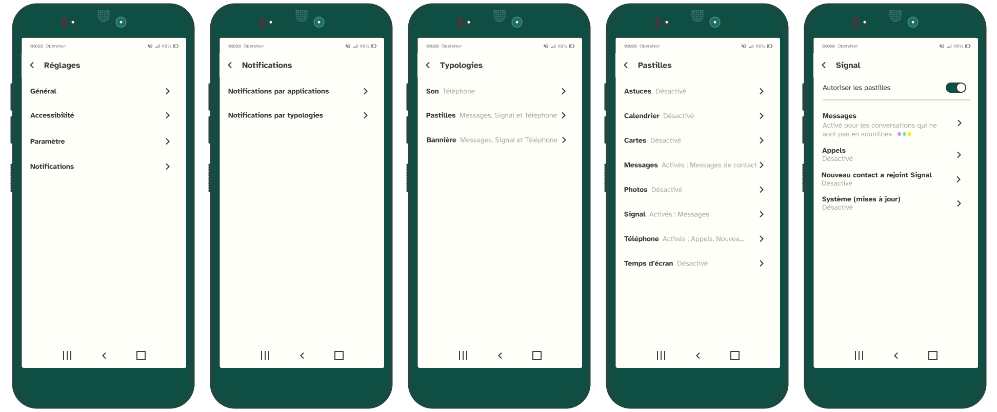 - En rentrant dans le détail des pastilles pour Signal, il peut gérer le type d'élément (messages, appels, nouveau contact, système, etc.) pour lesquels il aura une pastille.
