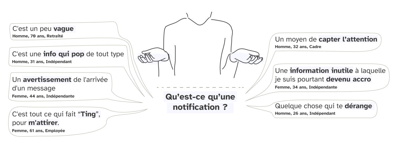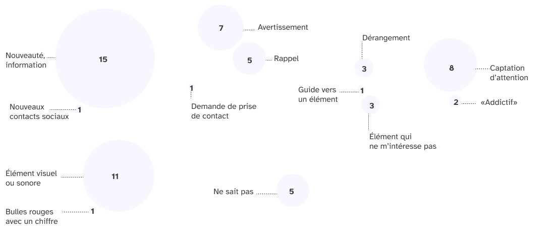 Pour presque la moitié des interviewés, la notification est liée à la notion de nouveauté et d'information. Pour un tiers, c’est un élément visuel ou sonore. Un quart des interviewés l’associe à de la captation d‘attention ou de l’avertissement. Plus ponctuellement, on retrouve le fait que l’on ne sait pas ce qu'est qu’une notification ainsi que la notion de rappel, dérangement, un élément qui n'intéresse pas.