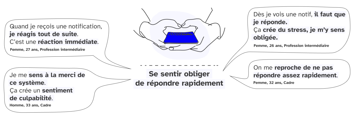- Dès que je vois une notification, il faut que je réponde. Ça crée du stress, je m’y sens obligée. (Femme, 26 ans, profession intermédiaire) ;