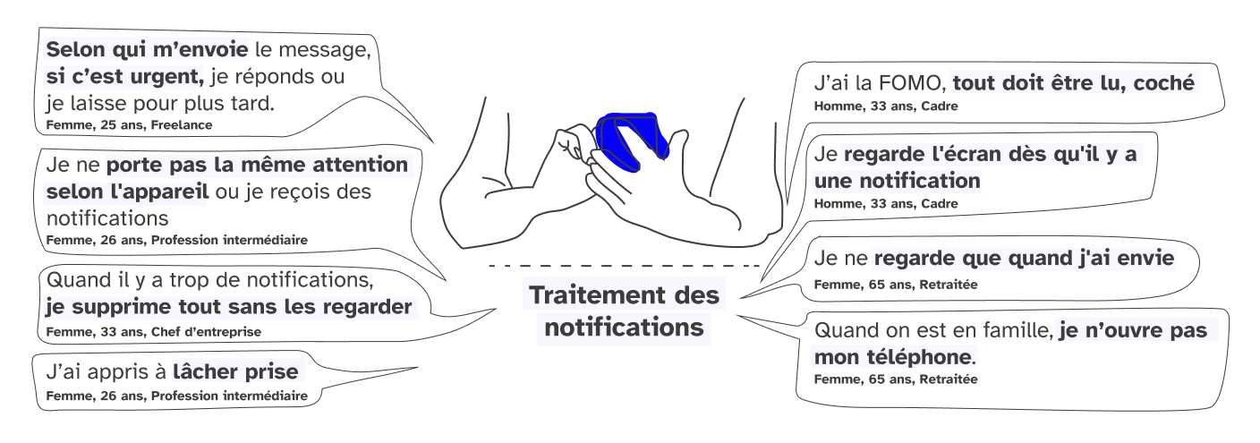 Un autre élément que l’on a questionné dans l’interview était de comprendre comment les gens vivaient les notifications au quotidien. C'est-à-dire, comment ils traitaient les notifications, réagissaient aux notifications et comment ils vivaient avec leur téléphone.