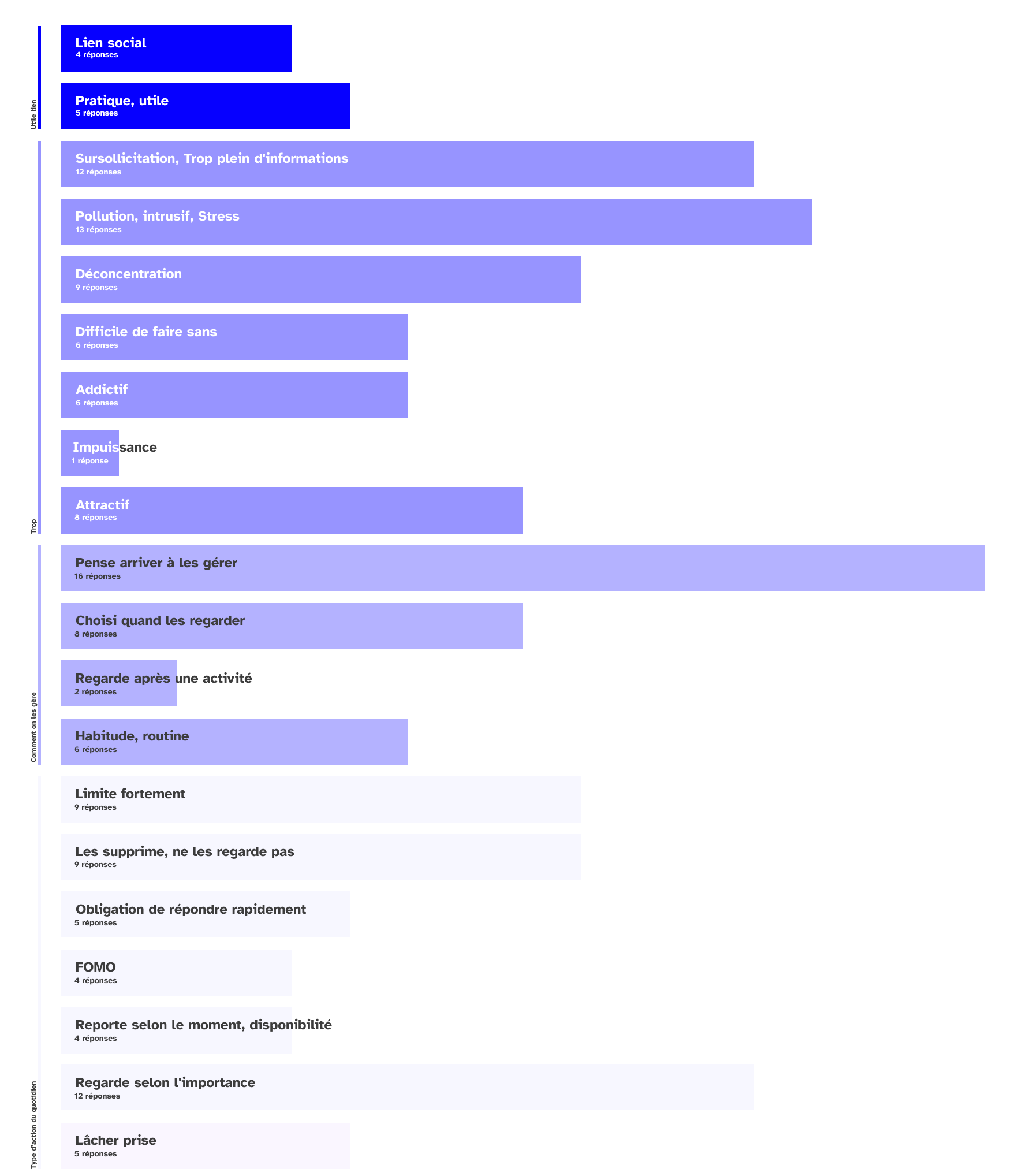 La notification a un apport d’utilité et de lien social, mais est vécue au quotidien par un grand nombre des participants comme excessif. Elles sont gérées et traitées de manière différente selon les participants (répond directement, les suppriment, choisissent quand les regarder, etc.), même si la moitié pense arriver à les gérer au quotidien.