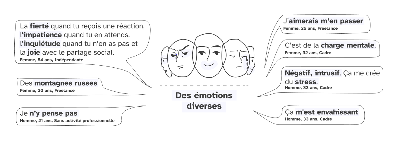 - La fierté quand tu reçois une réaction, l’impatience quand tu en attends, l’inquiétude quand tu n’en as pas et la joie avec le partage social. (Femme, 54 ans, indépendante) ;