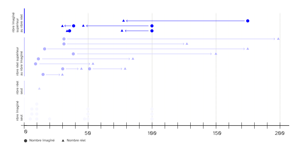 5 nombres imaginés étaient supérieurs au nombre réel (100 imaginé pour 76, 40 pour 30, 175 pour 79, 35 pour 34, 100 pour 45).